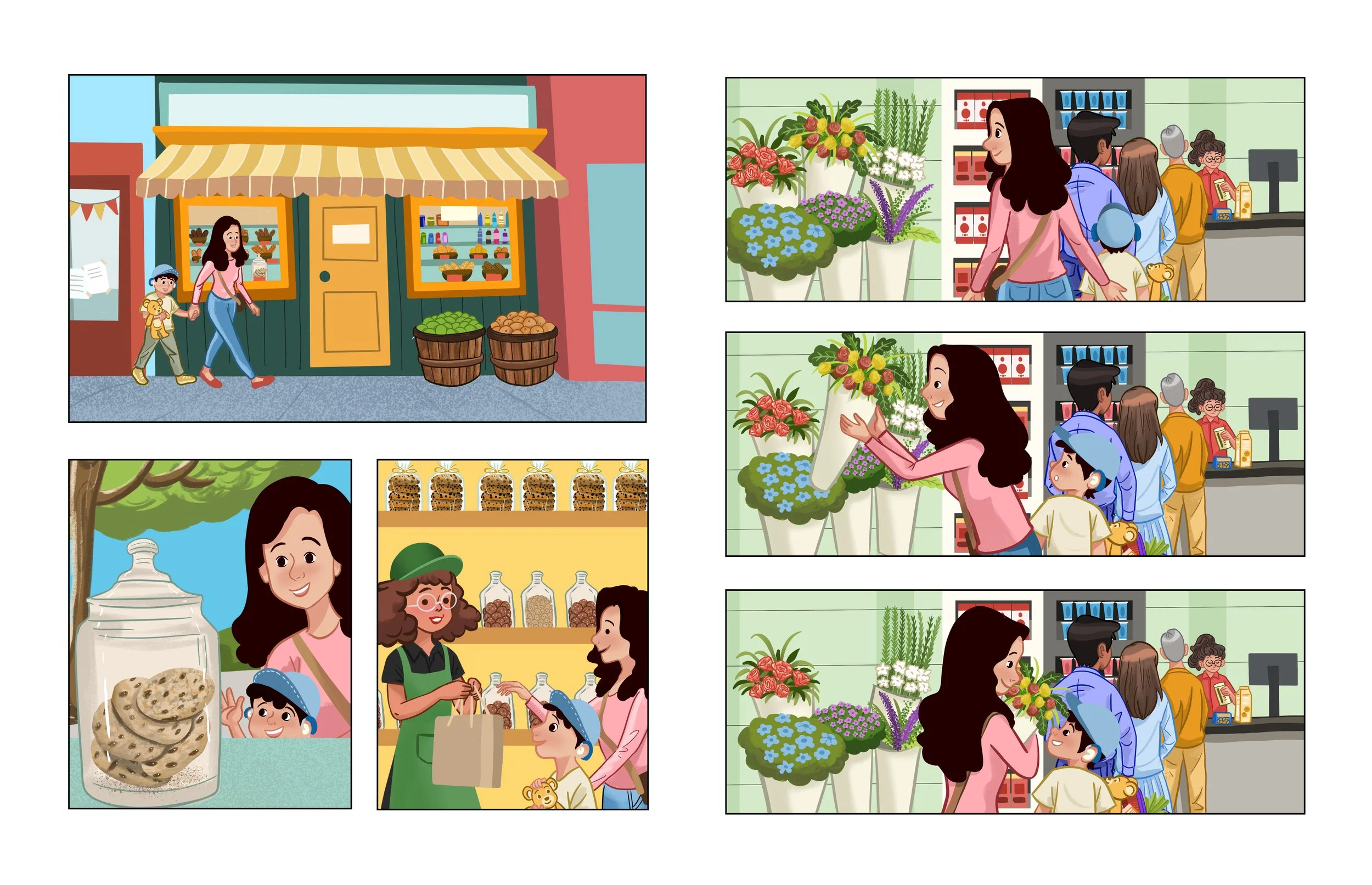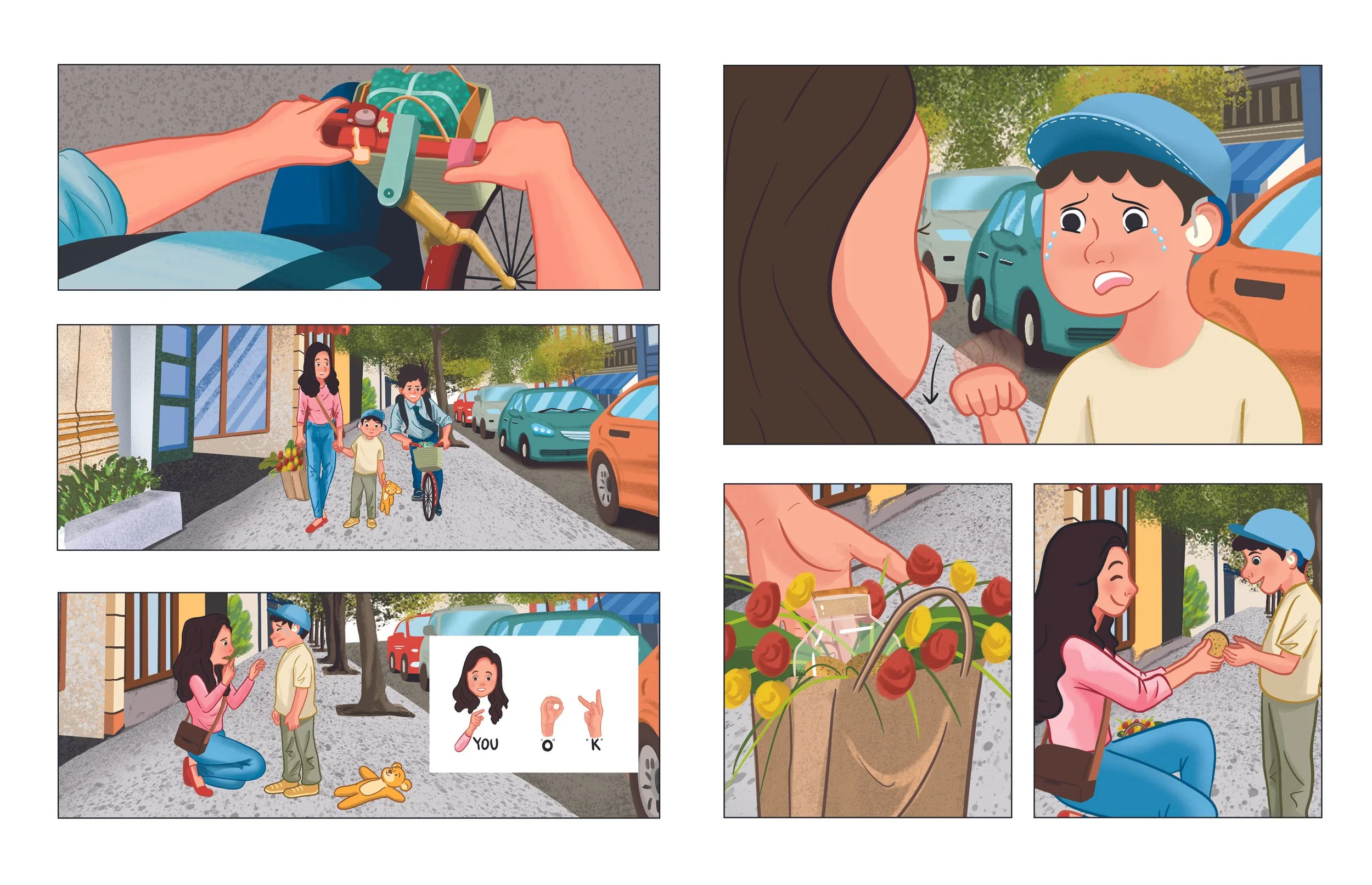 In this wordless picture book, a Deaf boy and his mother enjoy a walk through their community. Together, they greet their neighbors, stop by the playground, spy a bird's nest in a tree and buy cookies at the grocery store. Later, they visit their new neighbors, a woman and her daughter, who have only recently immigrated from another country. Although the girl is shy, and the two kids speak different languages -- American Sign Language (ASL) and Arabic -- find a way to communicate and become fast friends.